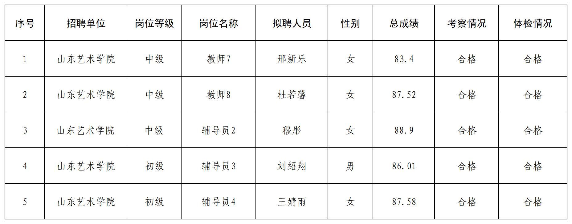 根据事业单位公开招聘有关规定,按照岗位招聘计划,山东艺术学院组织完成了公开招聘考试、考察、体检等工作,现对拟聘用人员进行公示。公示期为5个工作日,自2026年2月2日至2026年2月6日。公示期间,如对公示人选有异议,请及时向山东艺术学院人事处反映。